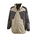 En 94 % polyester 6 % élasthane. 2 couches laminées. Doublure en taffetas matelassée. Imper respirant, déperlant et léger, coutures étanchées. Fermeture par zip anti-froid sous rabat aggripant. Capuche amovible ouatinée. Bas ajustable par cordon élastique. 5 poches. Renforts épaules et coudes. Poche intérieure porte-documents. ISO11092 et EN31092. Existe aussi en : XXXL