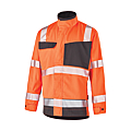 En 70% polyester recyclé, 30% coton bio/équitable, 270 gr/m². Doublure en 100% polyester. Fermeture à glissière. Vêtement éco-responsable, respirant, léger, réfléchissant, imperméable et résistant aux frottements. Poignets réglables par pattes de serrage.EN ISO 20471 2013 + A1 : 2016 Classe 2
