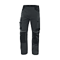 Coupe regular. Taille côtés élastiqués, braguette fermée par zip sous rabat. 7 poches dont 1 pour le mètre. Porte-badge amovible inclus. Triples coutures.